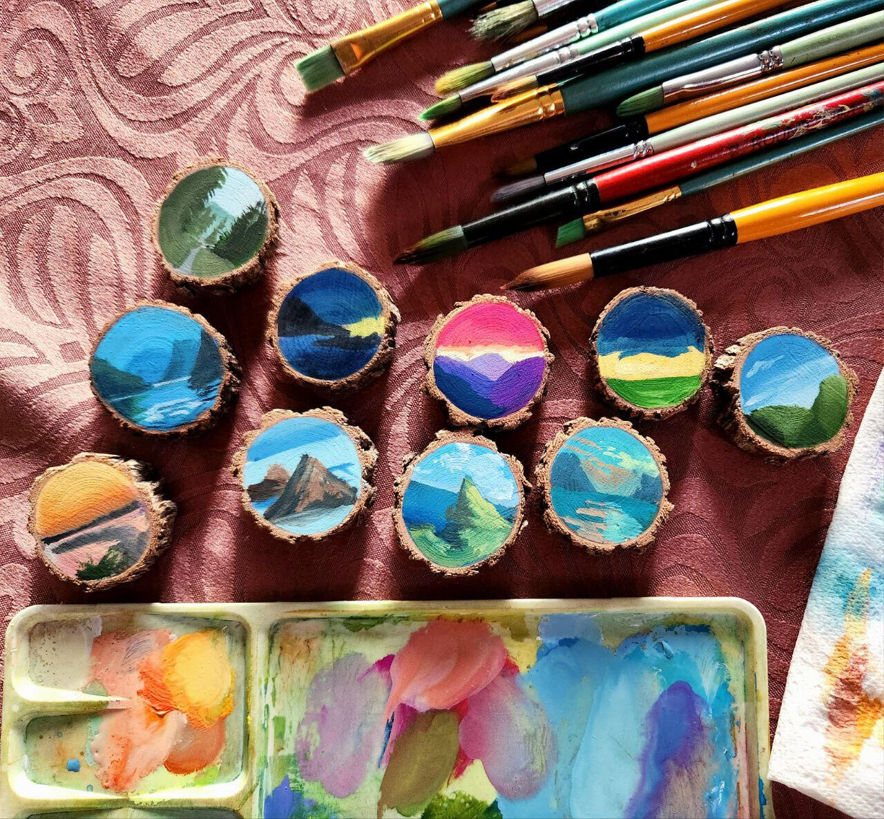 These coasters are approx. 7-9mm thick and painted in acrylic paint. They have been triple sealed with a satin finish to ensure longevity. Each painting is a look into my personal life experiences and come from locations I have travelled to or are local.